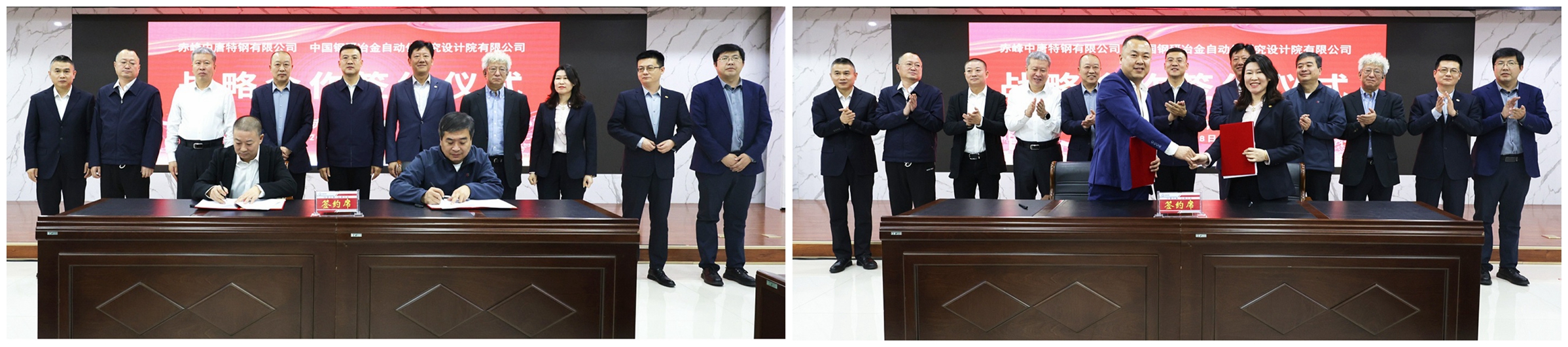 自動(dòng)化院總經(jīng)理?xiàng)罟夂婆c中唐特鋼副董事長(zhǎng)馬得紅代表雙方簽訂戰(zhàn)略合作協(xié)議。中國(guó)鋼研人工智能(工程)事業(yè)部(以下簡(jiǎn)稱“智能部”)副總經(jīng)理劉茹與中唐特鋼總經(jīng)理助理馮蘭超簽訂《中唐特鋼全流程智能管控項(xiàng)目》合同。